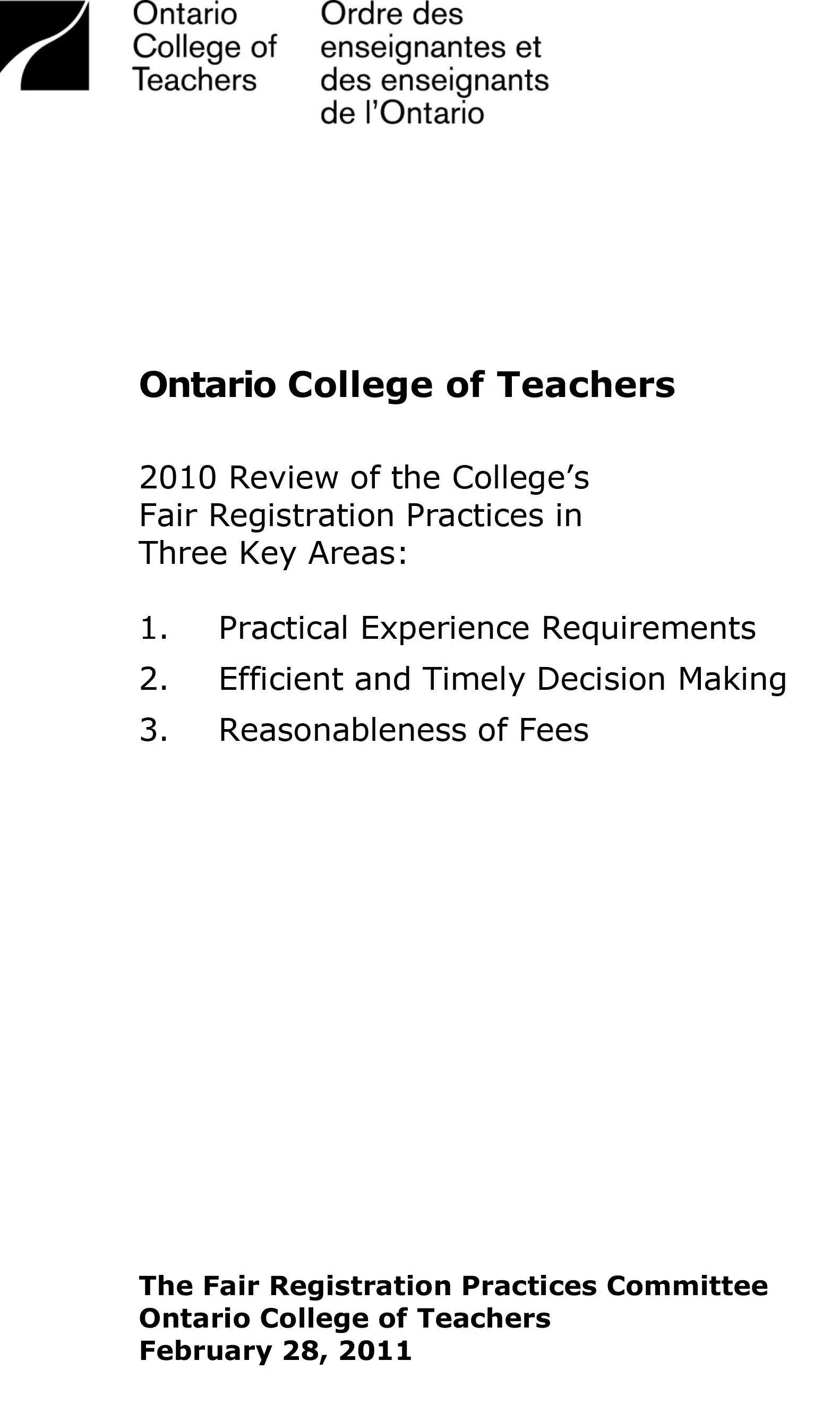 Report on the procedures the College uses to certify teachers. Submitted for 2010 as required to the Office of the Fairness Commissioner.